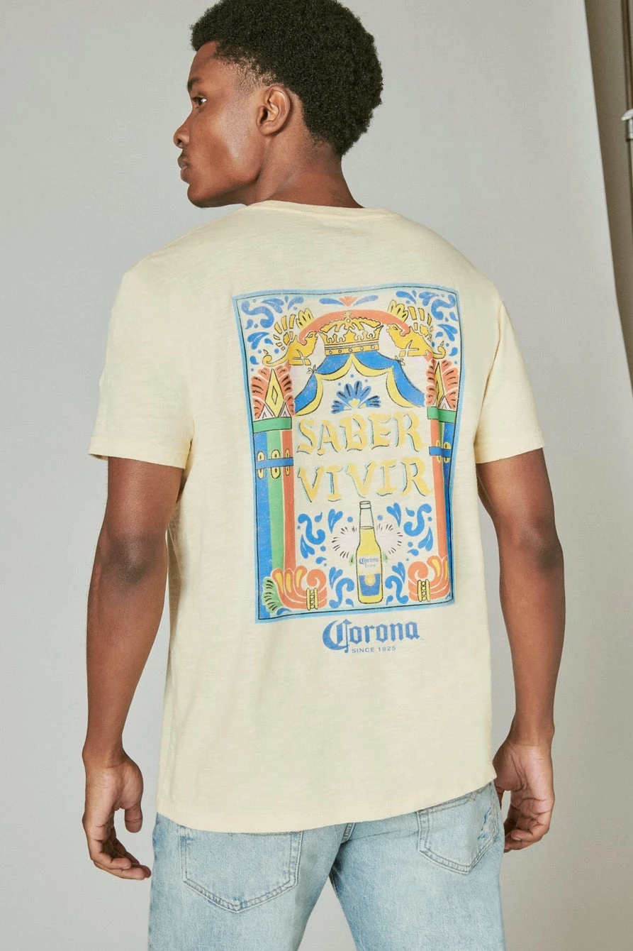 Feel the summer vibes in this soft, vintage-washed tee with refreshing Corona logo graphics on the front and back sides.